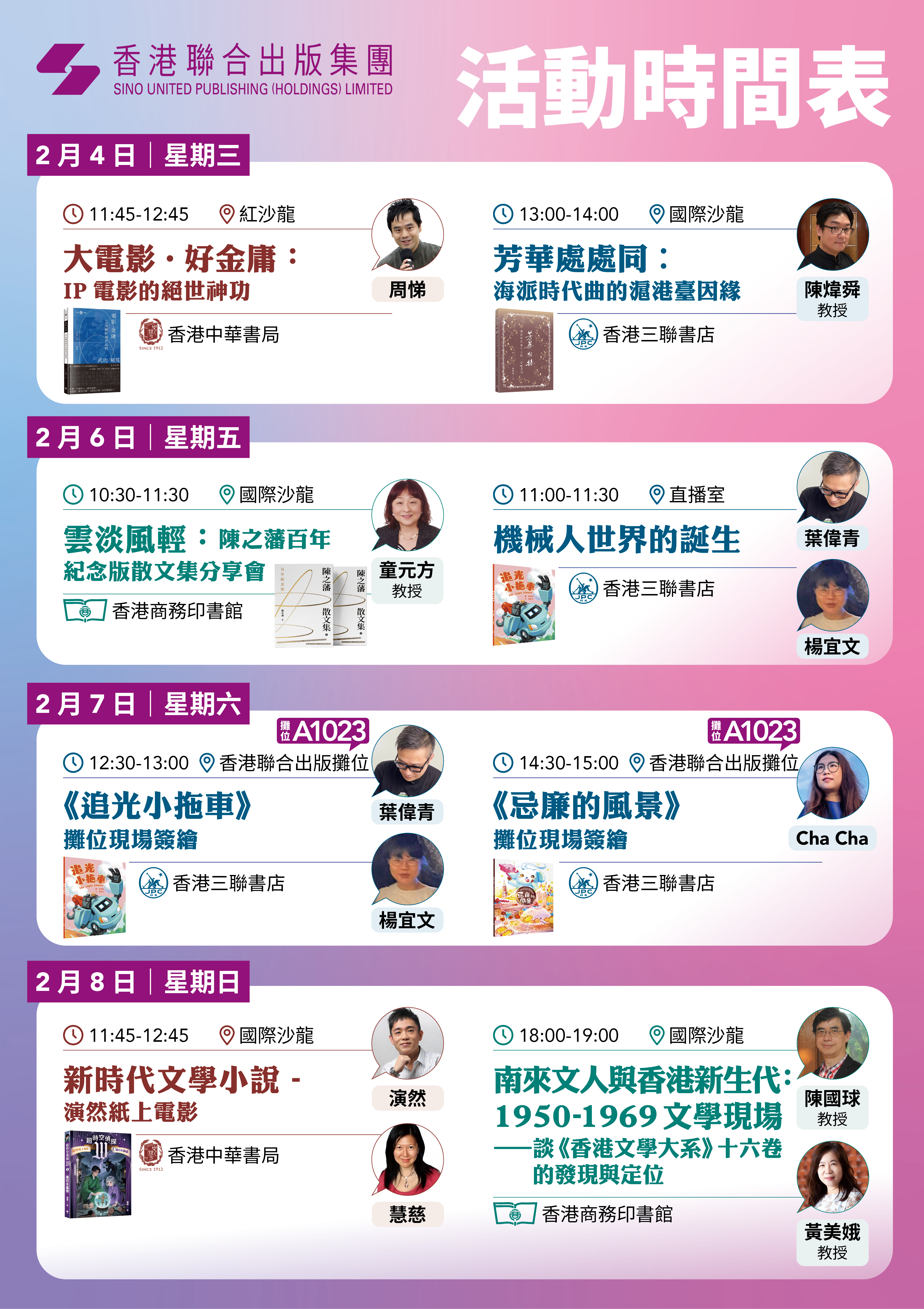 集團旗下香港三聯書店、香港中華書局及香港商務印書館,將於書展期間舉辦多場文化活動及大會直播間活動等,邀約香港知名作家及文化名人來到現場與讀者近距離交流,從文學、音樂、親子閱讀等不同面向,講述他們的香港故事。詳情如下: